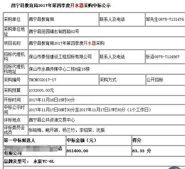 近日,在永宸總部的大力支持下,通過云南昌寧縣招標(biāo)流程,永宸代理商一舉拿下“昌寧縣教育局2017年第四季度開水器采購項(xiàng)目”。這次中標(biāo)的212臺永宸溫?zé)嵝凸?jié)能飲水機(jī)【YC-6L】將分別供給昌寧縣多所學(xué)校使用,可充分滿足師生們的飲水需求,給他們一個健康安全的飲水環(huán)境。